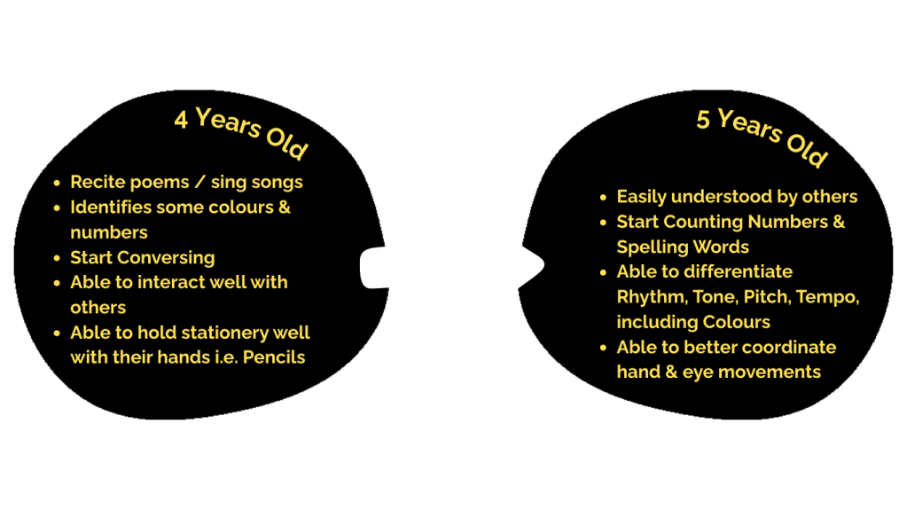 As the good age to start learning music is from 4-5 years old onwards, we can refer to the following list as a typical milestone guide achieved by children when they reach the age of either 4 or 5 years old. However, it’s worth noting that this list is not exhaustive and is not limited to only these, as other factors plays a part in it, and it varies based on each child’s learning style, pace and strength.